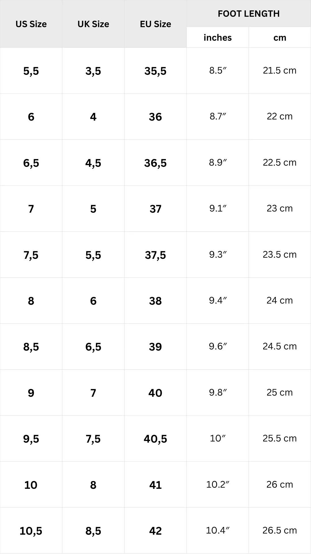 Have wide feet? We recommend going half a size up for a more comfortable fit.